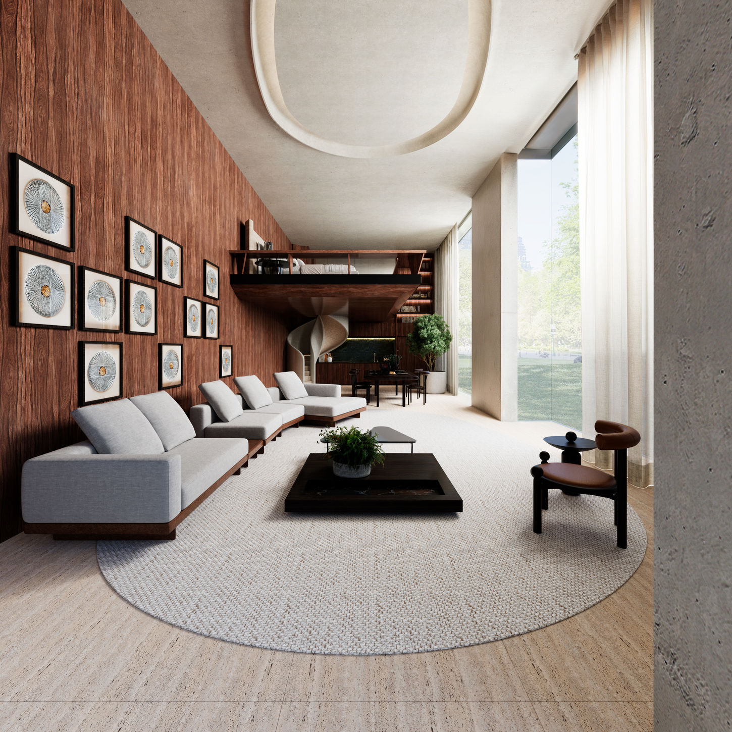 A configuração espacial foi estrategicamente pensada para incorporar um mezanino, potencializando a amplitude do ambiente e reforçando a sensação de estar em um ponto elevado da cidade, como um apartamento no 30º andar com vista para a Avenida Paulista ou até mesmo para Nova York.