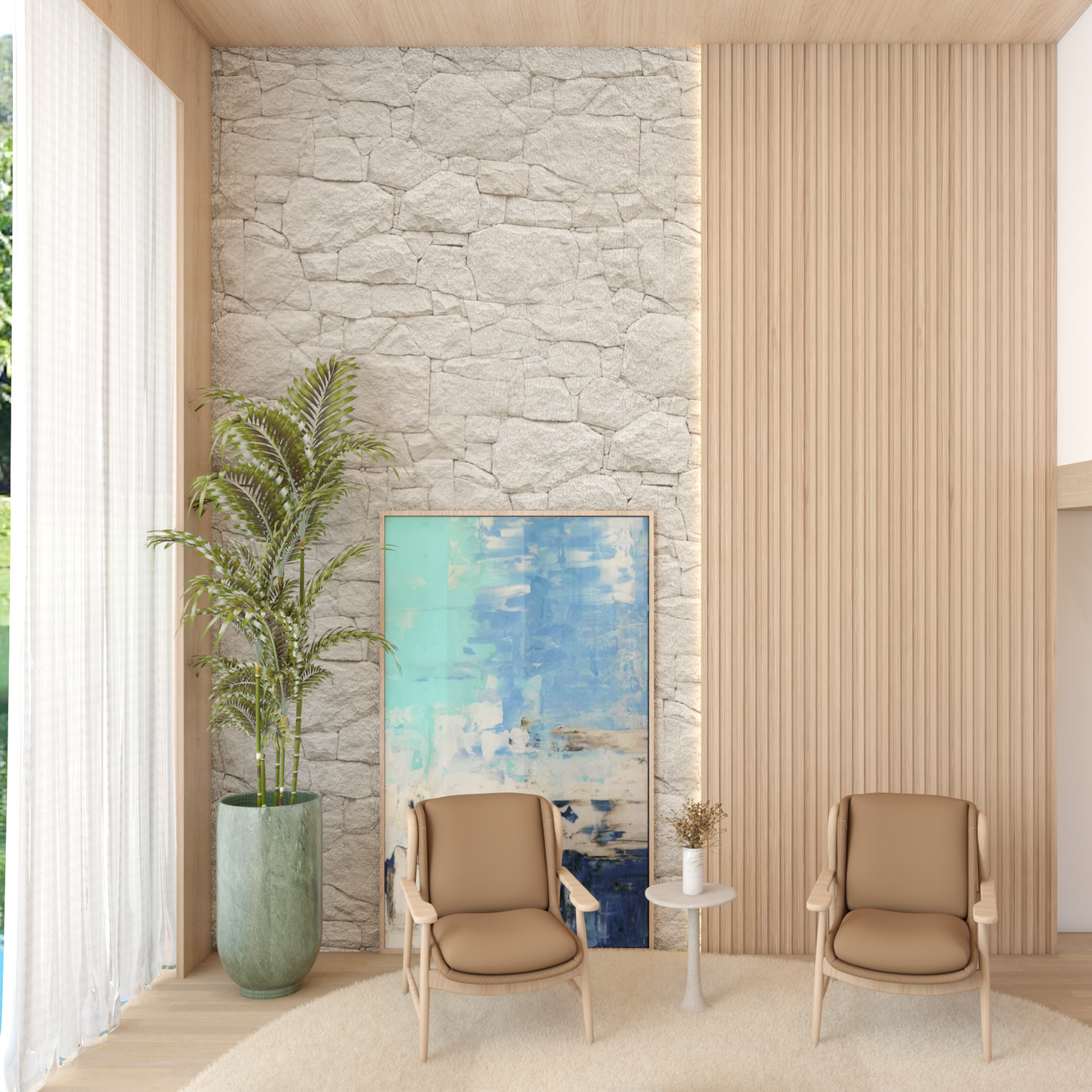 A partir dessa inspiração, surgiu a ideia de criar um ambiente que incorporasse elementos naturais, como a madeira utilizada na estante, no piso, no teto e no pórtico da esquadria. A pedra natural, que forma um painel na parede de pé direito duplo, e as mesinhas de centro em mármore complementam a composição.