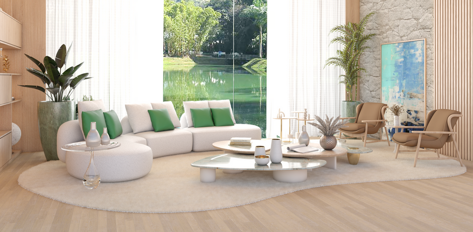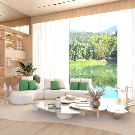 Esta sala de estar foi concebida a partir da escolha da poltrona Poe, assinada por Victor Vasconcelos, que simboliza delicadeza e fluidez. Seu design evoca leveza, ao mesmo tempo que se destaca pela robustez e elegância, com linhas que transmitem suavidade.