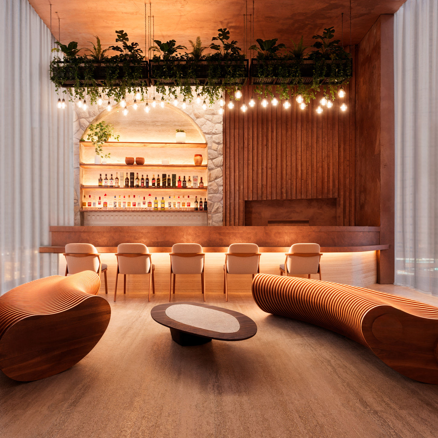 O Banco Infinito foi a peça escolhida para dar fluidez ao espaço, com sua forma sinuosa que dialoga com o conceito orgânico do projeto. Seu design contínuo e envolvente reforça a proposta de um gourmet que vai além da funcionalidade, tornando-se um ponto de encontro e contemplação. A fusão entre madeira, texturas naturais e um layout fluido transforma a experiência do usuário, proporcionando um refúgio sofisticado.